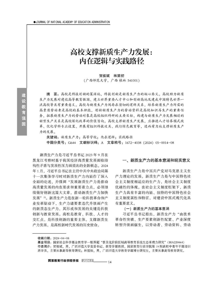 新著速递|贺祖斌,林盟初:高校支撑新质生产力发展:内在逻辑与实践路径(《国家教育行政学院学报》2024年第5期)