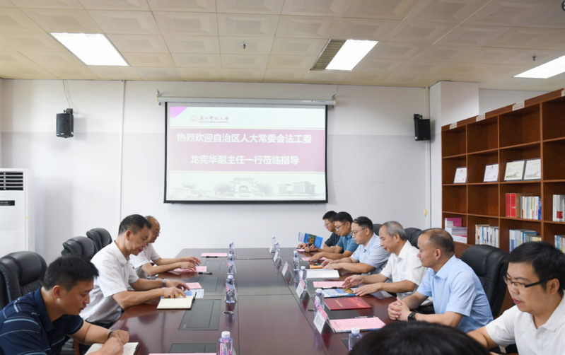 法学院主要负责人汇报了广西地方立法研究评估与咨询服务基地(广西师范大学)承接立法委托项目、提供立法论证、开展理论研究和实践调研等相关情况。