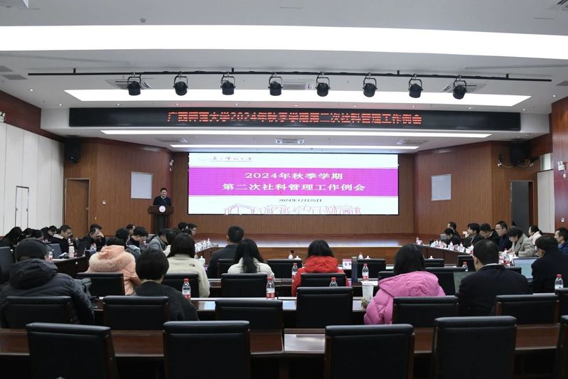 12月25日,我校在育才校区国教楼201报告厅召开2024年秋季学期第二次社科管理工作例会。校党委常委、副校长宋树祥出席会议并讲话。各文科学院(部)院长、科研副院长、骨干教师、科研秘书及社科处/广西文科中心全体工作人员共90余人参加会议。会议由社科处处长肖富群主持。