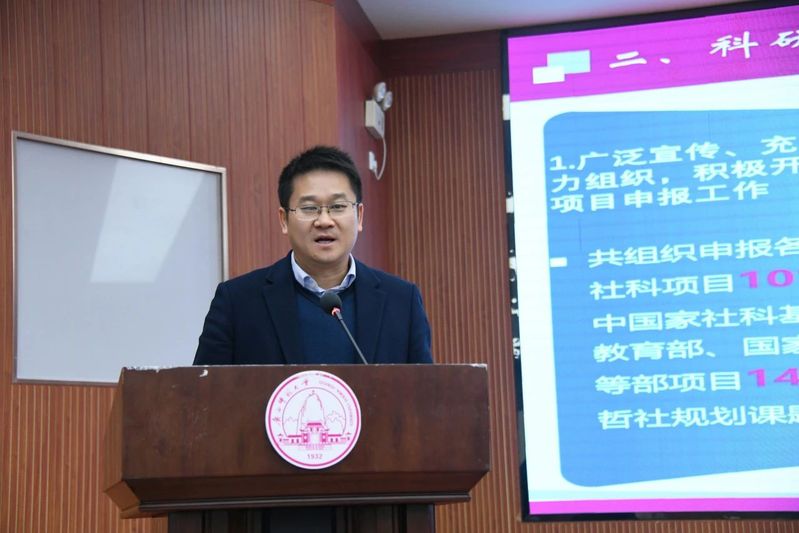 社科处肖富群处长分别从体制机制建设、科研项目申报立项、科研成果与奖项产出、社会服务与成果推广、平台和智库团队建设、学术交流与学术品牌建设等六个方面系统总结了2024年我校社科研究工作举措与建设成效以及存在的不足,并对2025年社科管理工作重点,特别是各类国家社科基金申报组织工作进行了重点部署。他强调,各类国家社科基金项目申报要以加强有组织科研为抓手,以减少在研项目和“三无人员”存量为工作重点,增加申报人员总量,强化目标管理,重过程服务;要聚焦选题的高水准和大格局,创新申报工作做法;要深入挖掘科研成果新的增长点,积极探索社科研究可持续发展路径。他表示,社科处也将在新的一年里进一步强化科研管理,推行“下沉服务,上门施策”,与各学院(部)保持密切沟通和配合,切实抓好项目选题与论证辅导,共同推动学校社科工作更上一层楼。