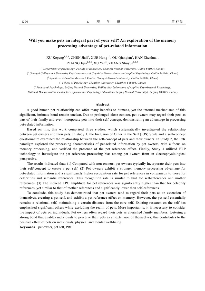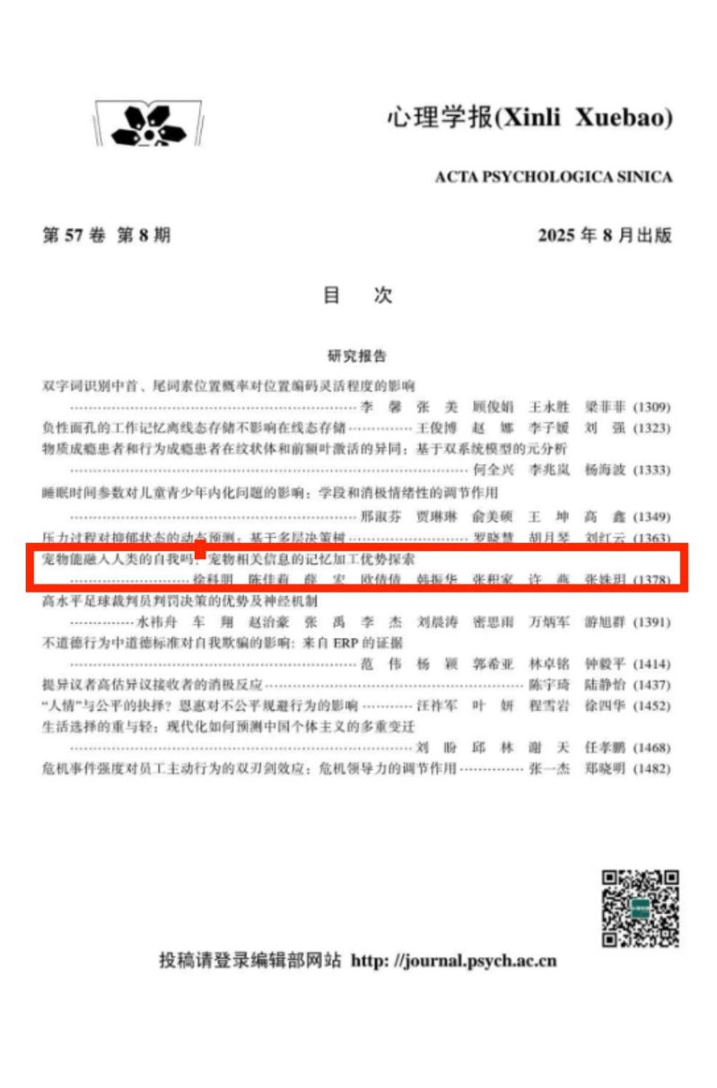 近日,我校教育学部社会心理研究团队在权威期刊《心理学报》2025年第8期发表学术论文《宠物能融入人类的自我吗?宠物相关信息的记忆加工优势探索》。文章第一作者为我校教育学部徐科朋副教授,通讯作者为教育学部张姝玥教授。