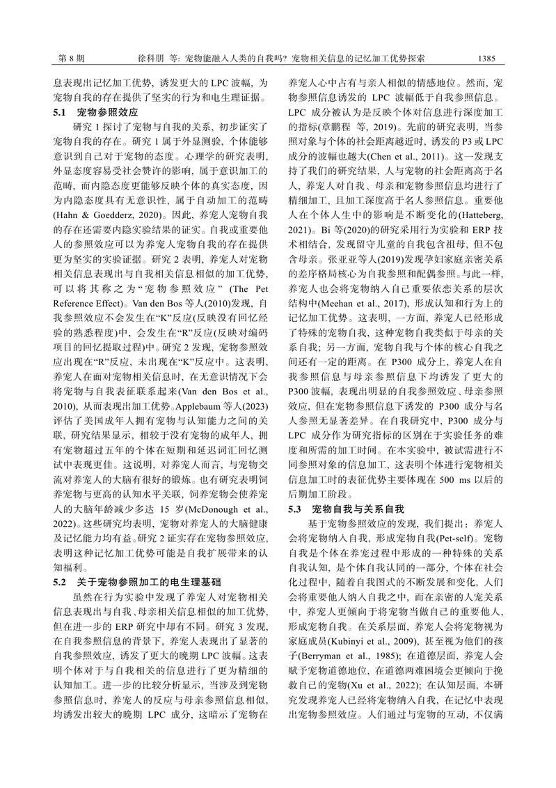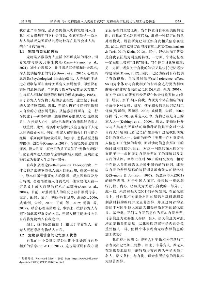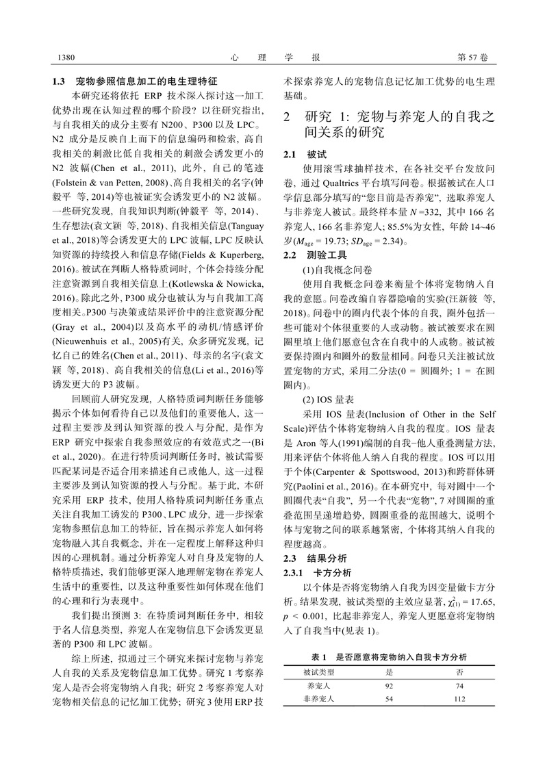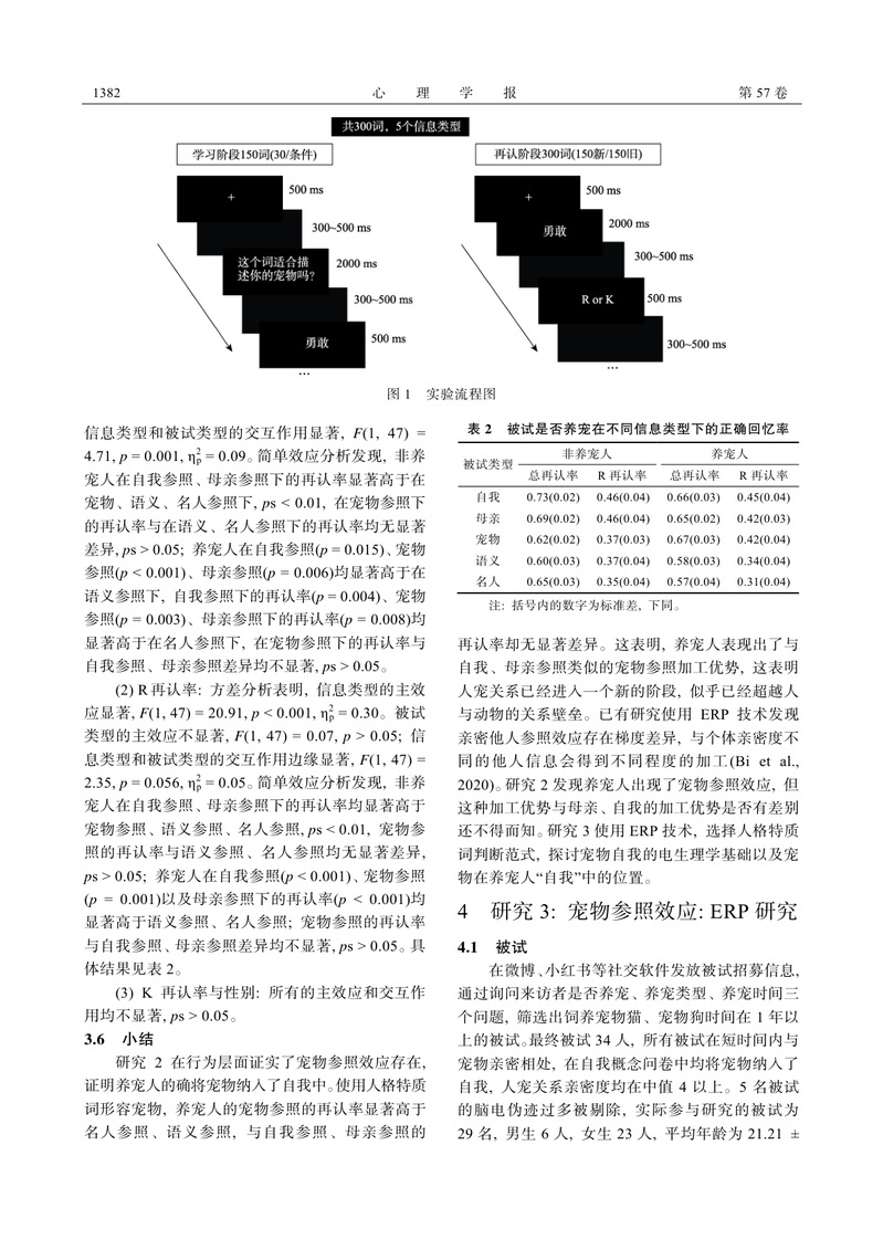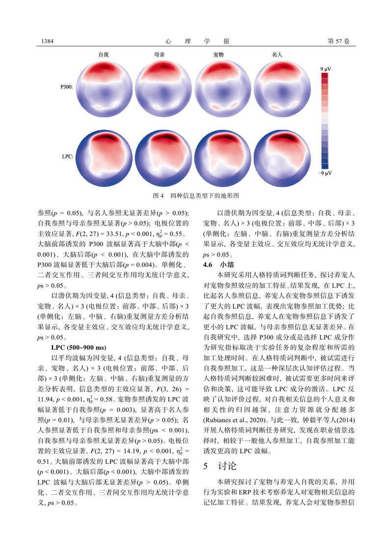 该文章基于宠物数量激增、人宠情感纽带日益紧密的社会背景,探索宠物这一特殊存在是否会被人类纳入“自我概念”之中。文章采用三个研究,基于问卷法、行为实验(R/K范式)和事件相关电位(ERP)技术,探讨宠物与养宠人自我的关系及宠物信息的记忆加工优势;结果显示:第一,养宠人会将宠物纳入自我,形成“宠物自我”;第二,养宠人对宠物相关信息表现出记忆加工优势(宠物参照效应),其再认率与自我、母亲参照无差异;第三,“宠物自我”与个体核心自我存在一定距离,具体为宠物参照诱发的LPC波幅显著高于名人参照,与母亲参照无差异,但显著低于自我参照。该研究在自我扩展理论的基础上提出了“宠物自我”这一新概念,解释了人宠深度情感联结的内在心理机制;同时有利于对现有人宠关系的解读,为理解宠物对人类身心健康的积极作用提供了重要依据。