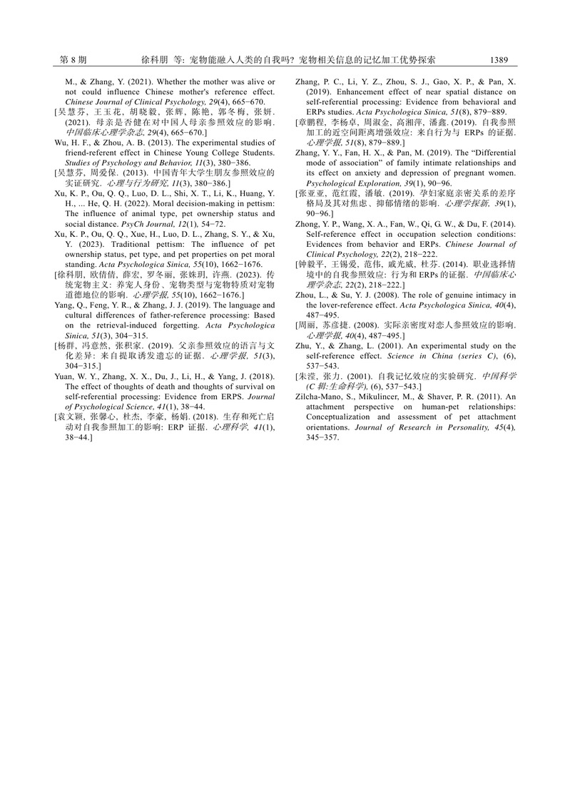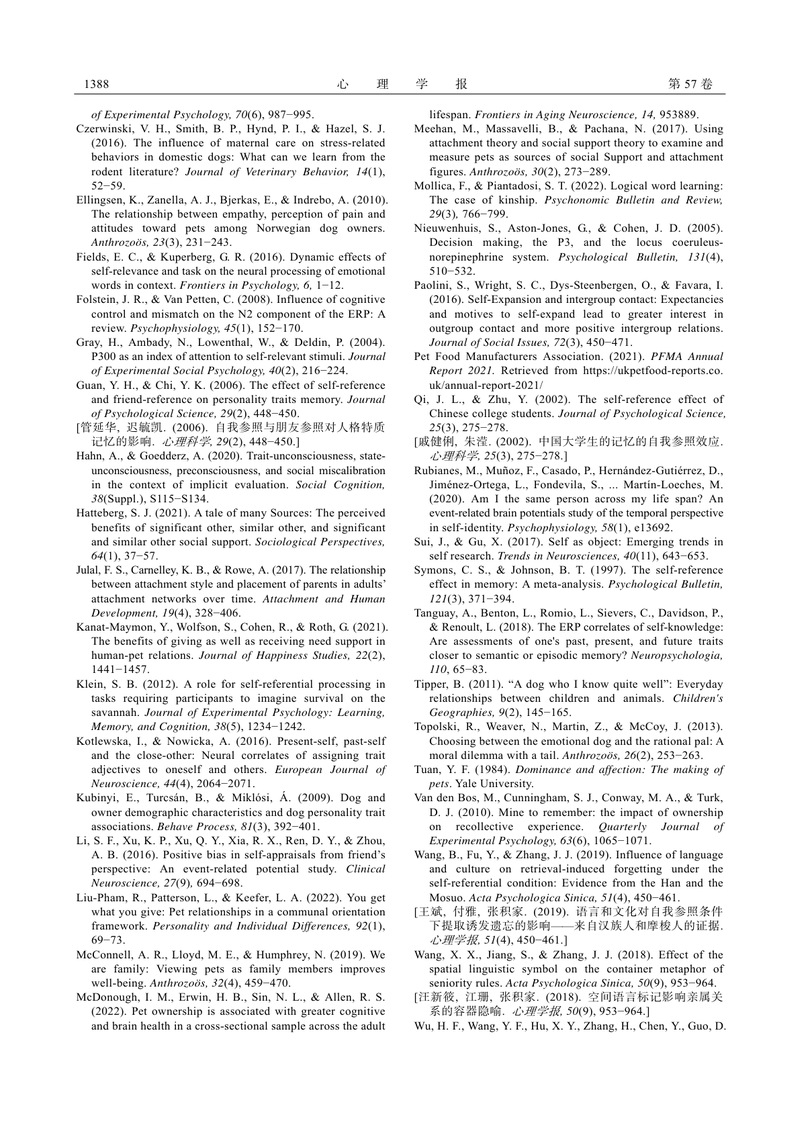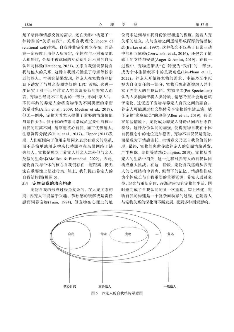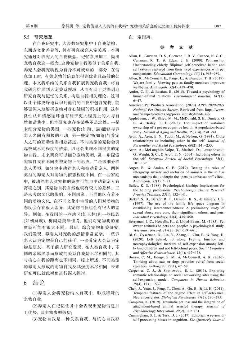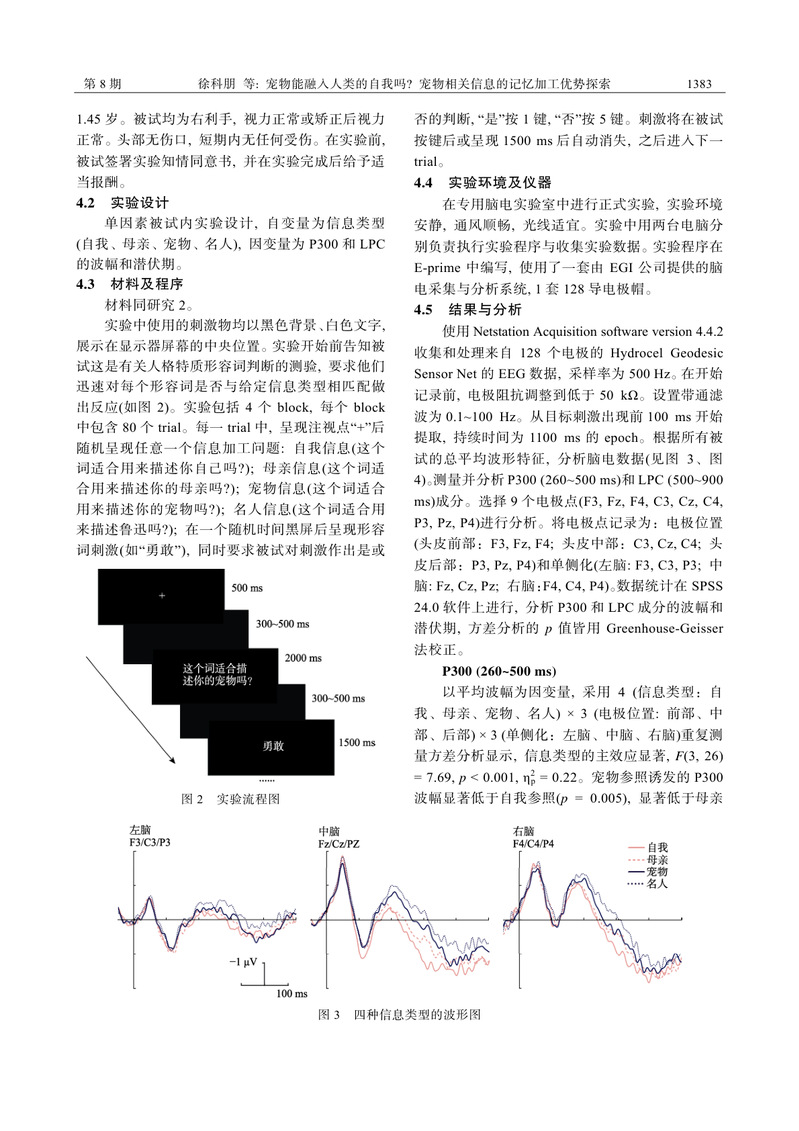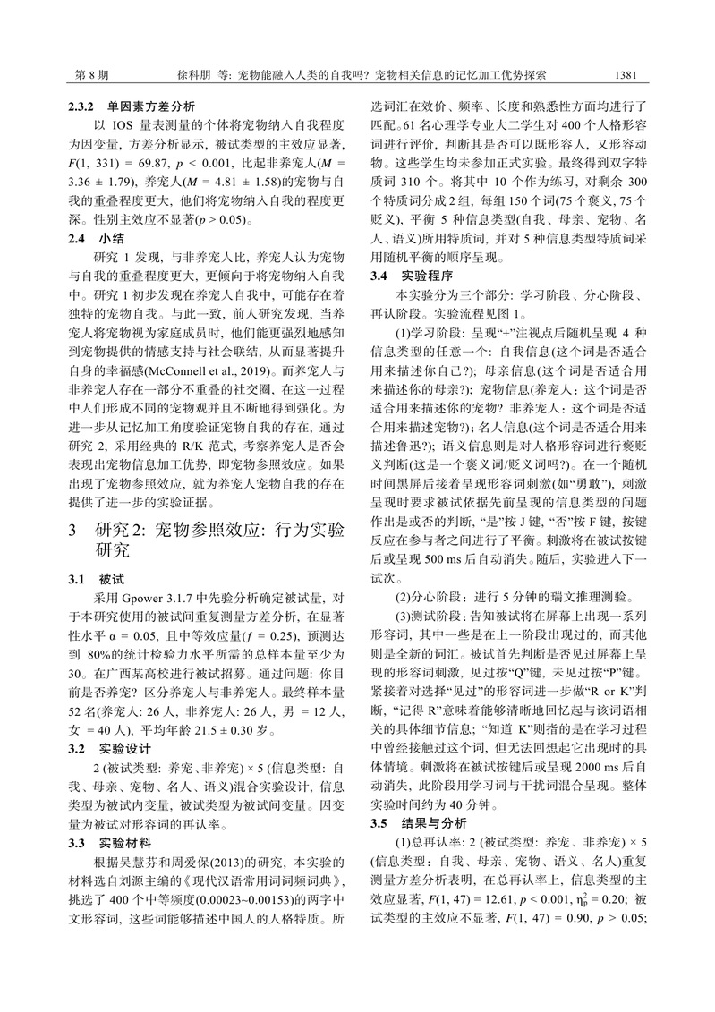该文章基于宠物数量激增、人宠情感纽带日益紧密的社会背景,探索宠物这一特殊存在是否会被人类纳入“自我概念”之中。文章采用三个研究,基于问卷法、行为实验(R/K范式)和事件相关电位(ERP)技术,探讨宠物与养宠人自我的关系及宠物信息的记忆加工优势;结果显示:第一,养宠人会将宠物纳入自我,形成“宠物自我”;第二,养宠人对宠物相关信息表现出记忆加工优势(宠物参照效应),其再认率与自我、母亲参照无差异;第三,“宠物自我”与个体核心自我存在一定距离,具体为宠物参照诱发的LPC波幅显著高于名人参照,与母亲参照无差异,但显著低于自我参照。该研究在自我扩展理论的基础上提出了“宠物自我”这一新概念,解释了人宠深度情感联结的内在心理机制;同时有利于对现有人宠关系的解读,为理解宠物对人类身心健康的积极作用提供了重要依据。
