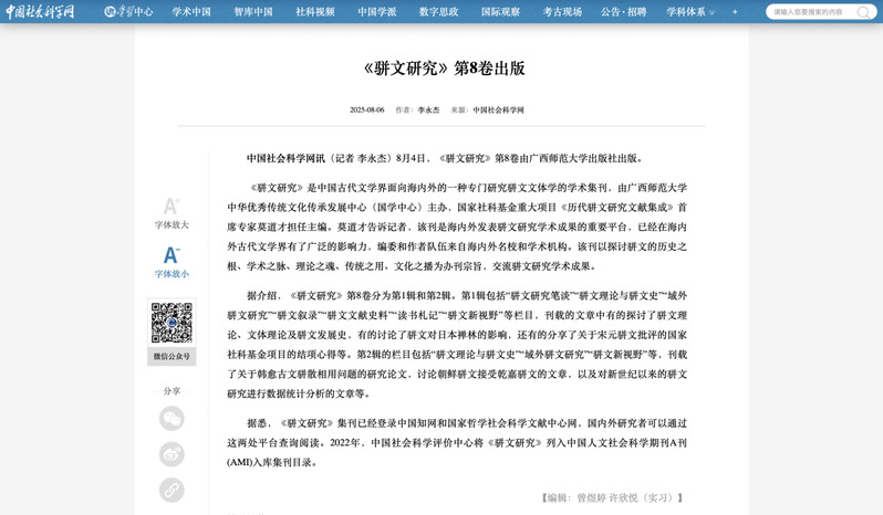 中国社会科学网于2025于8月6日报道了由我校中华优秀传统文化传承发展中心(国学中心)主任、广西特聘专家、广西高校人文社科重点研究基地桂学研究院研究员、国家社科基金重大项目《历代骈文研究文献集成》首席专家莫道才教授担任主编的《骈文研究》集刊出版的消息,并采访了莫道才教授。报道如下: