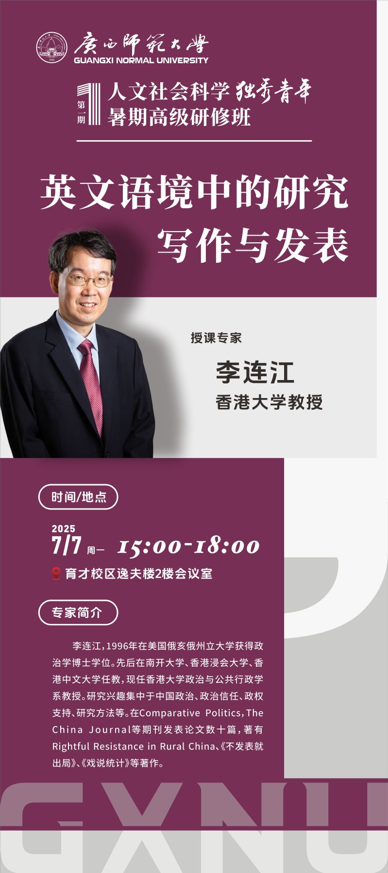 7月6日-11日,本期研修班共有15场人文社科学术讲座、工作坊举行。欢迎大家关注“广西师大科研微服务”公众号。我们会持续发布讲座预告信息。