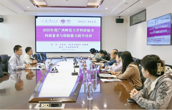 2025年10月21日,我校社科处在育才校区广西文科中心312会议室举办科研秘书科研素养与创新能力提升培训。本次培训聚焦科研秘书群体需求,特邀《改革与战略》总编辑、编审、正高级经济师王政武以《学术论文选题、写作与投稿:编辑的视角》为题作专题讲座。社科处处长肖富群主持活动。文科学院(部)科研秘书及社科处工作人员共10余人参会。