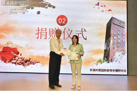 本次研讨会议程丰富、内容充实。主旨发言环节聚焦抗战时期新闻史、国际新闻传播、文学和新闻融合传播等方面。南京师范大学靖鸣教授、中国绿色时报广西记者站张雷站长,以及我校唐凌、刘铁群、王艳萍等专家分享了深刻的学术思考。圆桌论坛环节关注当下实践。两组专家围绕“如何加强桂林抗战文化研究”“抗战文化赋能桂林旅游”进行了思想碰撞。会上,中国著名战地记者、原国新社香港分社社长陆诒之子陆良年向中新社和我校捐赠其父所留手稿及照片等物品。原广西师专军训大队长、原广西省人民法院首任院长杨徳华之子杨小川向我校捐赠其父亲的工作手稿和物品。