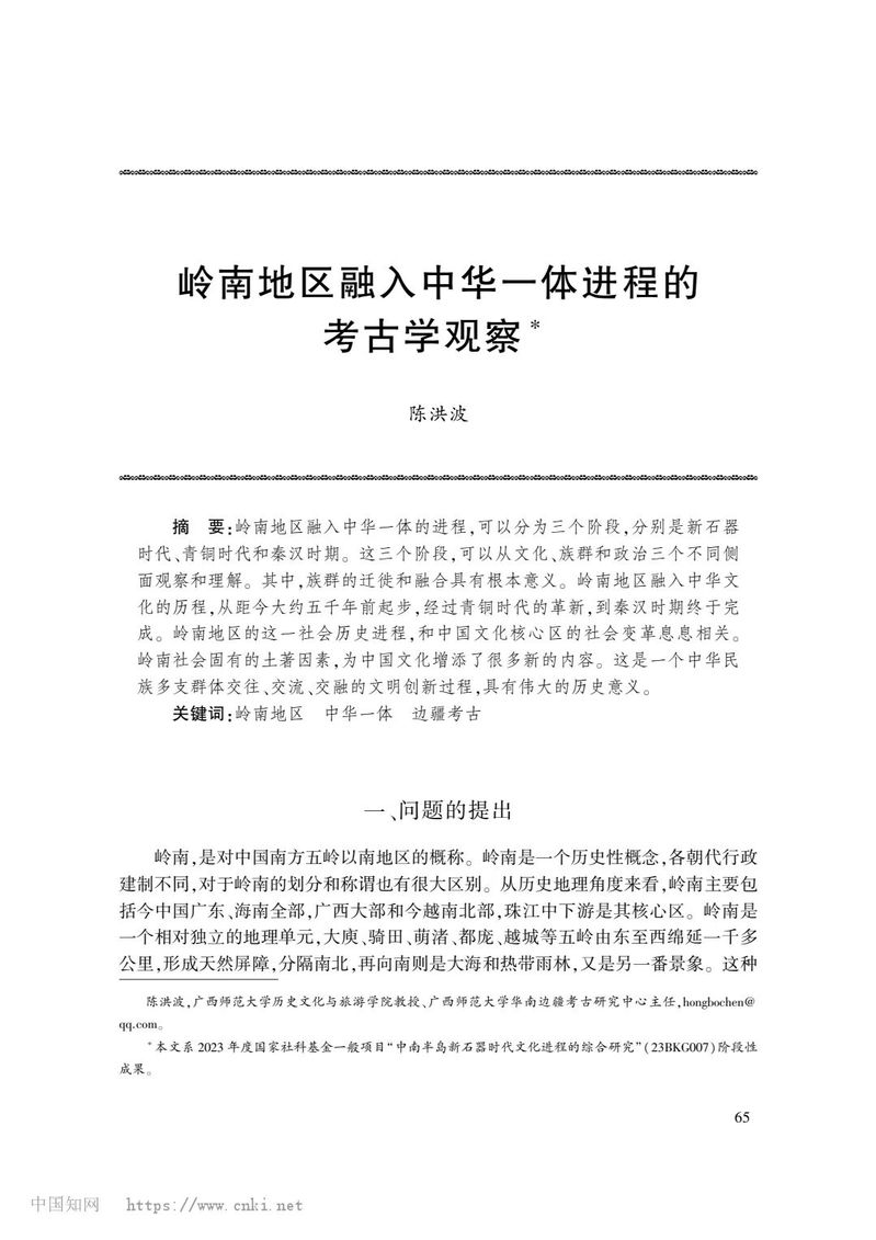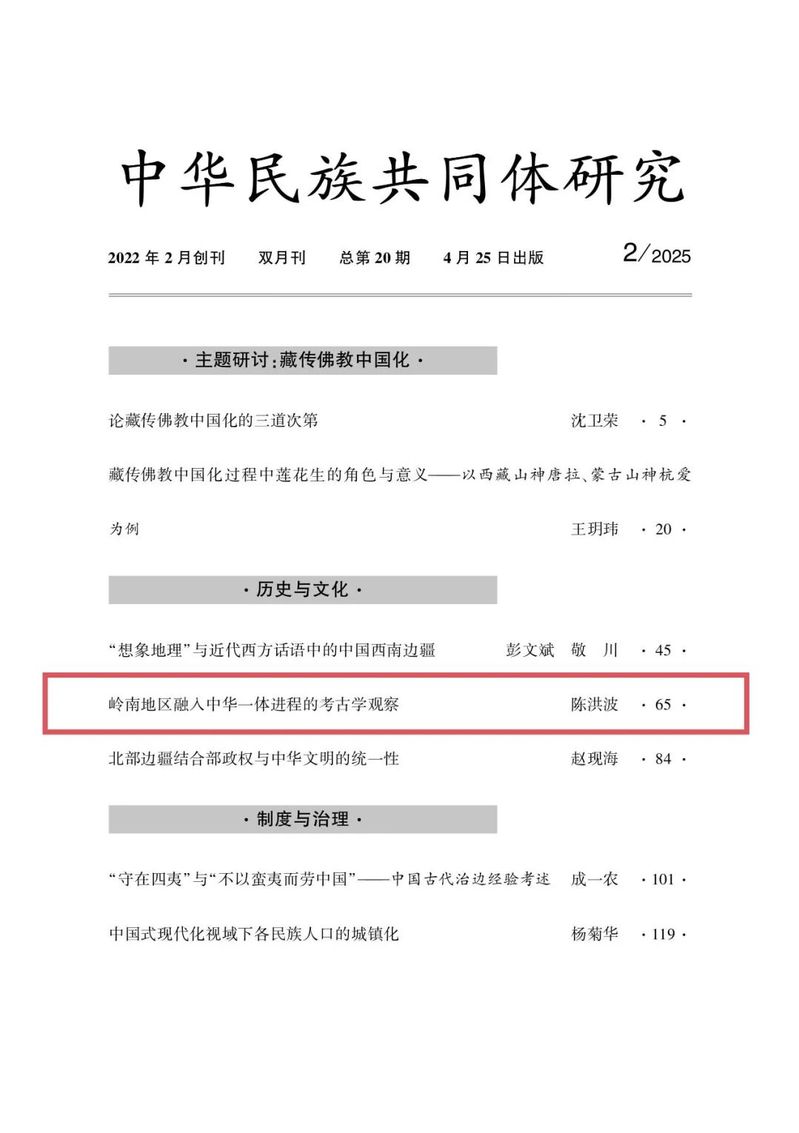 近日,广西师范大学历史文化与旅游学院教授、广西高校人文社科重点研究基地-华南边疆与周边国家研究中心研究员陈洪波发表在《中华民族共同体研究》2025年第2期上的学术论文《岭南地区融入中华一体进程的考古学观察》,被《新华文摘》2025年第19期全文转载。《新华文摘》由国家新闻出版署主管、人民出版社主办、新华文摘杂志社编辑出版,是大型理论性、综合性、资料性文摘类权威期刊。现转发于此,以飨读者。
