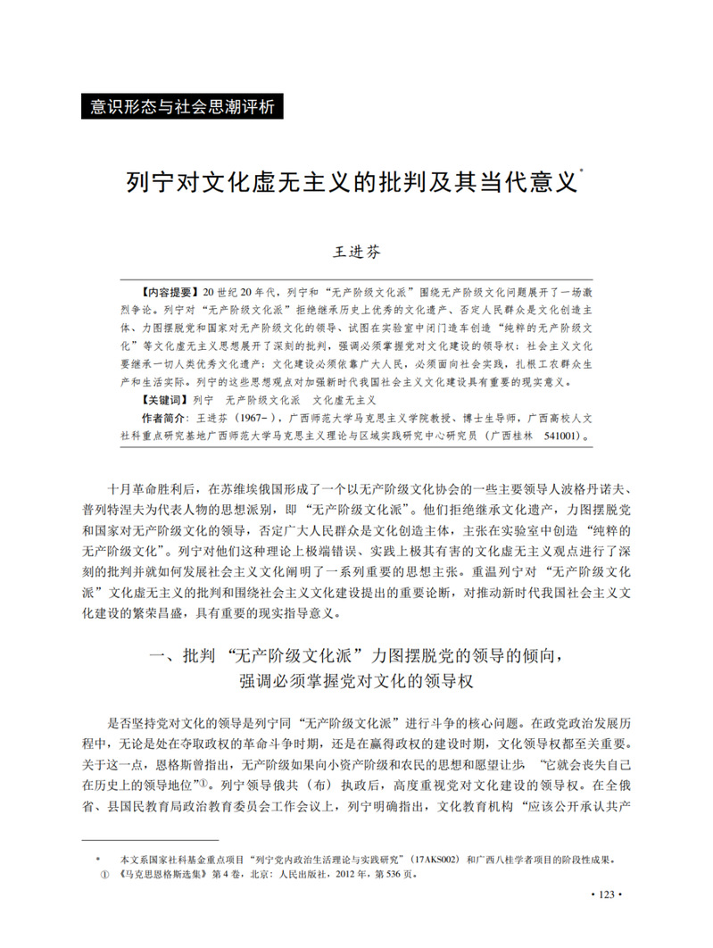 本期推出的论文《列宁对文化虚无主义的批判及其当代意义》,为广西第十七次社科优秀成果奖一等奖获奖成果。