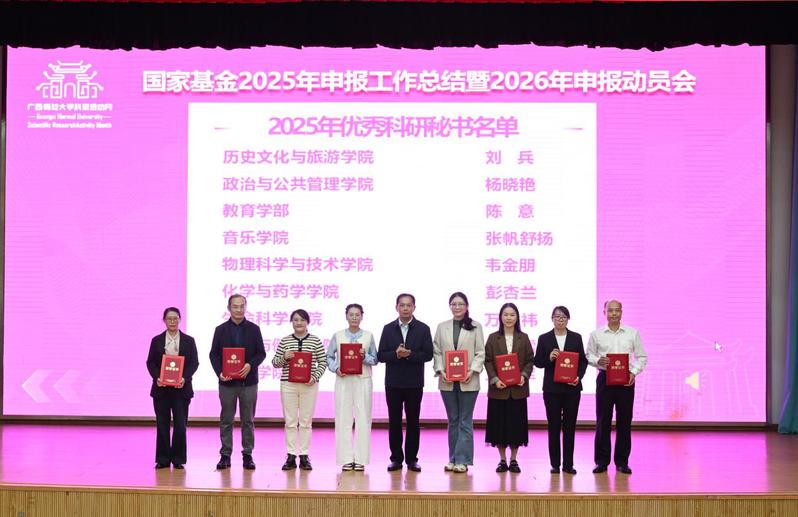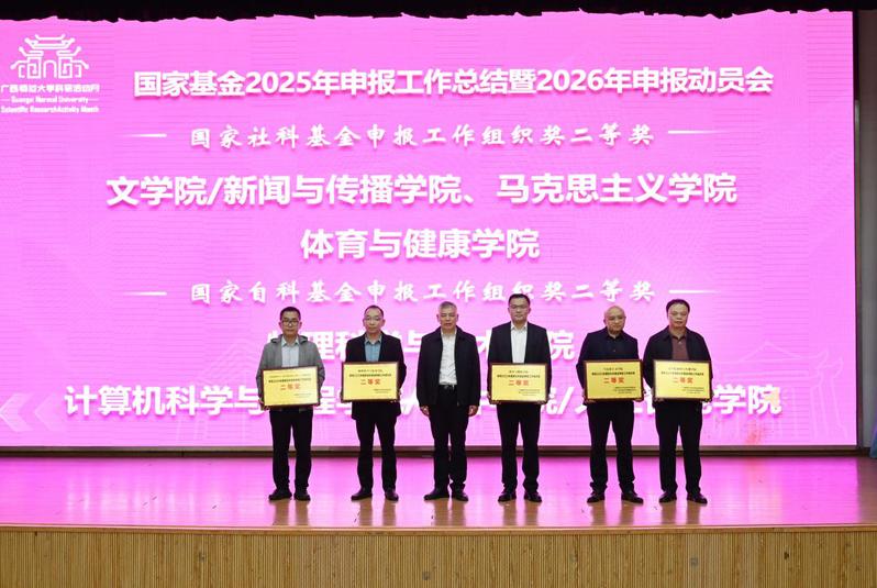 颁奖环节,贺祖斌、莫坷、林国庆、毛立刚分别为我校2025年国家基金申报工作组织奖一、二、三等奖的获奖单位,以及荣获我校2025年优秀科研秘书的先进代表颁发荣誉证书。