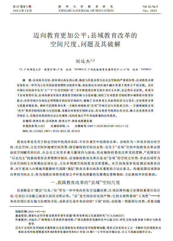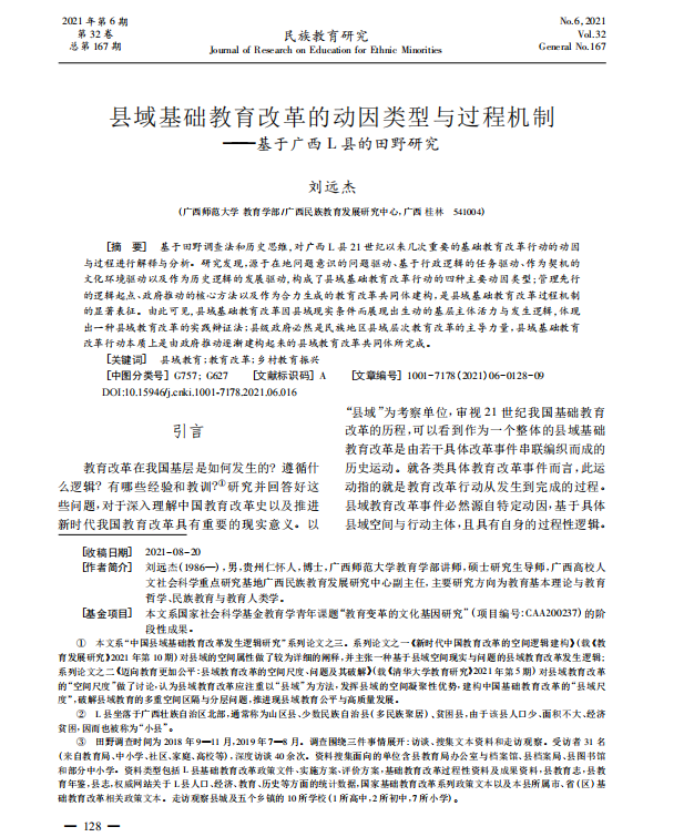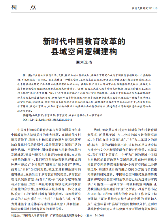 本期推出的论文《中国县域基础教育改革发生逻辑研究(之一至之三)》,为广西第十七次社科优秀成果奖二等奖获奖成果。