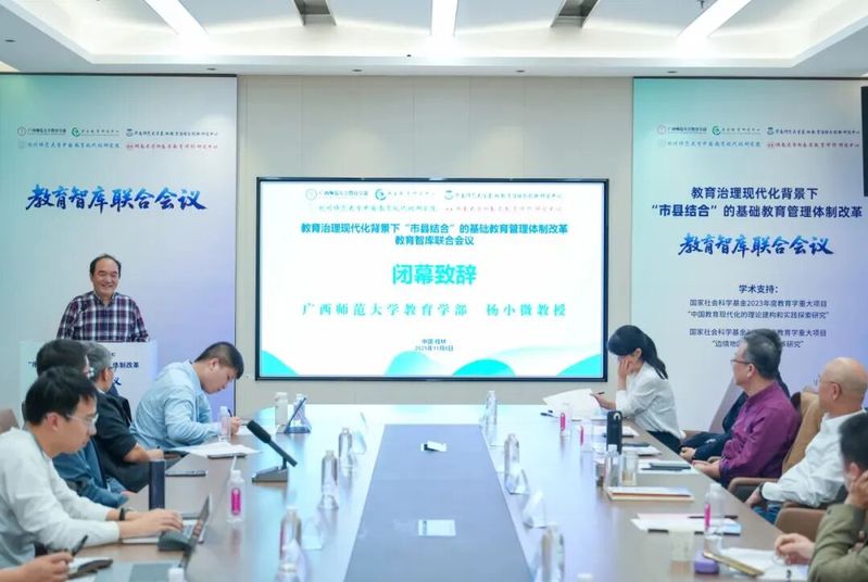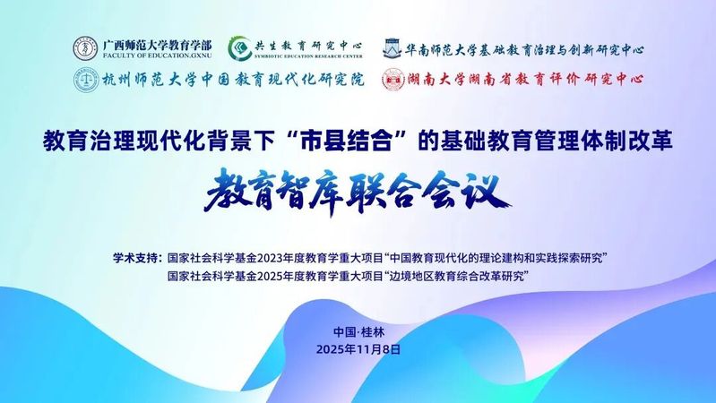 近日,“教育治理现代化背景下‘市县结合’的基础教育管理体制改革”专题研讨会暨教育智库联合会议在广西桂林顺利召开。本次会议由我校教育学部、广西高校人文社会科学重点研究基地—共生教育研究中心联合华南师范大学基础教育治理与创新研究中心、杭州师范大学中国教育现代化研究院、湖南大学湖南省教育评价研究中心共同主办。会议设置15场主旨报告和2场专题交流研讨,来自全国各地的60余名专家学者,围绕基础教育管理体制改革、县域教育治理创新以及县中振兴等核心议题进行深入探讨。