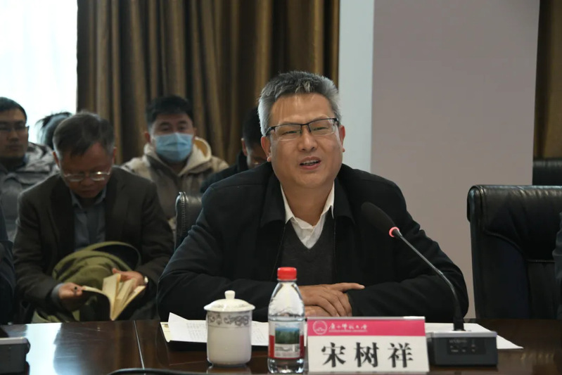 宋树祥代表学校对黄承伟研究员的莅临指导表示热烈欢迎与衷心感谢。结合我校智库建设的实践历程与发展愿景,他指出以有组织科研推动高校新型智库高质量发展作为推动学校科研高质量发展的战略支点,是服务国家战略与区域发展的重要支撑,是推动学科融合与学术创新的关键路径;长期以来我校高度重视高校新型智库建设,通过不断完善新型智库的体制机制建设,全面深化政产学研用协同创新,不断强化新型智库的战略研究能力、资源整合能力、调查研究能力、成果转化能力、对外交流能力建设;积极探索矩阵式创新范式,加强高校新型智库与政府智库、社会智库、企业智库、媒体智库协同创新;以广西人文社会科学发展研究中心为依托,打造广西高校智库服务平台和高校智库联盟;以广西高校人文社会科学重点研究基地建设为抓手,打造一批特色鲜明的智库;推进“问题+团队”的智库建设运作模式,开展关键问题订单式协同攻关,打造桂台合作与两岸融合研究团队等17个智库专家服务团队;探索建设共生教育智慧实验室等哲学社会科学实验室,以创建高能级科研创新平台和新型智库集群优势带动学校哲学社会科学的高质量发展。他强调,我校将推动优化学校新型智库建设体系,建强高水平的智库队伍和咨政研究团队,持续强化人文强桂品牌并加强广西人文社会科学发展研究中的协同及辐射带动作用,深化推进智库品牌声誉建设。