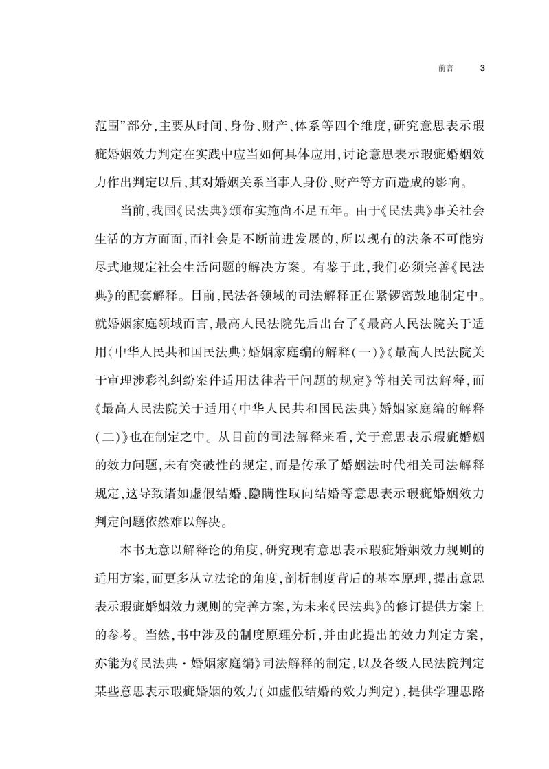 其中,在“意思表示瑕疵婚姻的界定”部分,成果侧重对意思表示瑕疵婚姻的内涵与外延予以明晰,将实践中常见的意思表示瑕疵婚姻类型化,厘清意思表示瑕疵缘何会对婚姻效力产生影响。在“意思表示瑕疵婚姻法律效力的基础”部分,从不同法学理论学说之间,探寻判定婚姻效力的决定性要素,确定意思表示瑕疵婚姻效力判定的基本理论。在“意思表示瑕疵婚姻法律效力的判定”部分,依据效力判定的基本理论,提取意思表示瑕疵婚姻法律效力判定的基本理念,形成意思表示瑕疵婚姻法律效力判定的基本标准,提出意思表示瑕疵婚姻法律效力判定的基本方案。在“意思表示瑕疵婚姻法律效力的范围”部分,主要从时间、身份、财产、体系等四个维度,研究意思表示瑕疵婚姻效力判定在实践中应当如何具体应用,讨论意思表示瑕疵婚姻效力作出判定以后,其对婚姻关系当事人身份、财产等方面造成的影响。