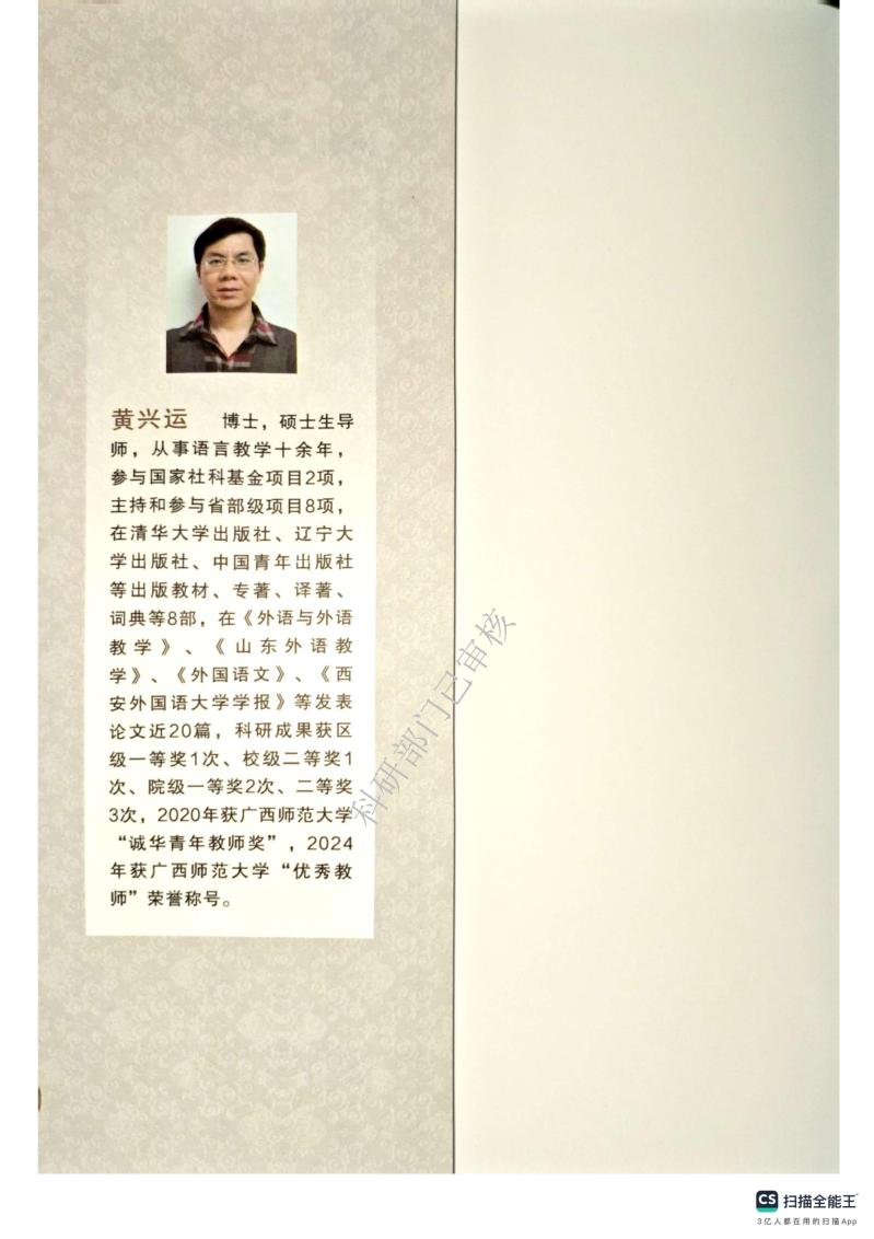 黄兴运(1982-),男,广西贵港人,广西师范大学外国语学院副教授,博士/硕士生导师,研究方向为语言文化与外语教学;参与完成国家社科基金项目2项、主持完成省级项目2项、厅级项目5项;在清华大学出版社、辽宁大学出版社等出版著作4部、教材2部、词典1部,完成厅级研究报告1篇(获优秀调研成果一等奖),在《中国外语》《外语与外语教学》等期刊发表论文20余篇;近年来获广西师范大学本科课堂教学水平优秀奖5次,诚华青年教师奖1次,优秀教师称号1次,校级“三创”赛最佳指导老师1次,区级“三创”赛优秀指导老师1次。