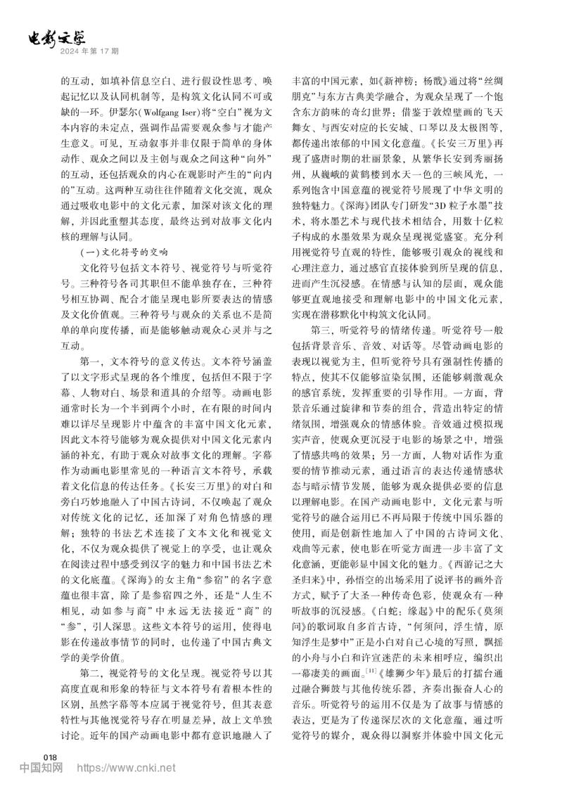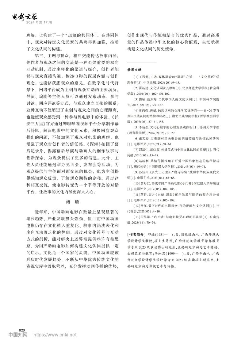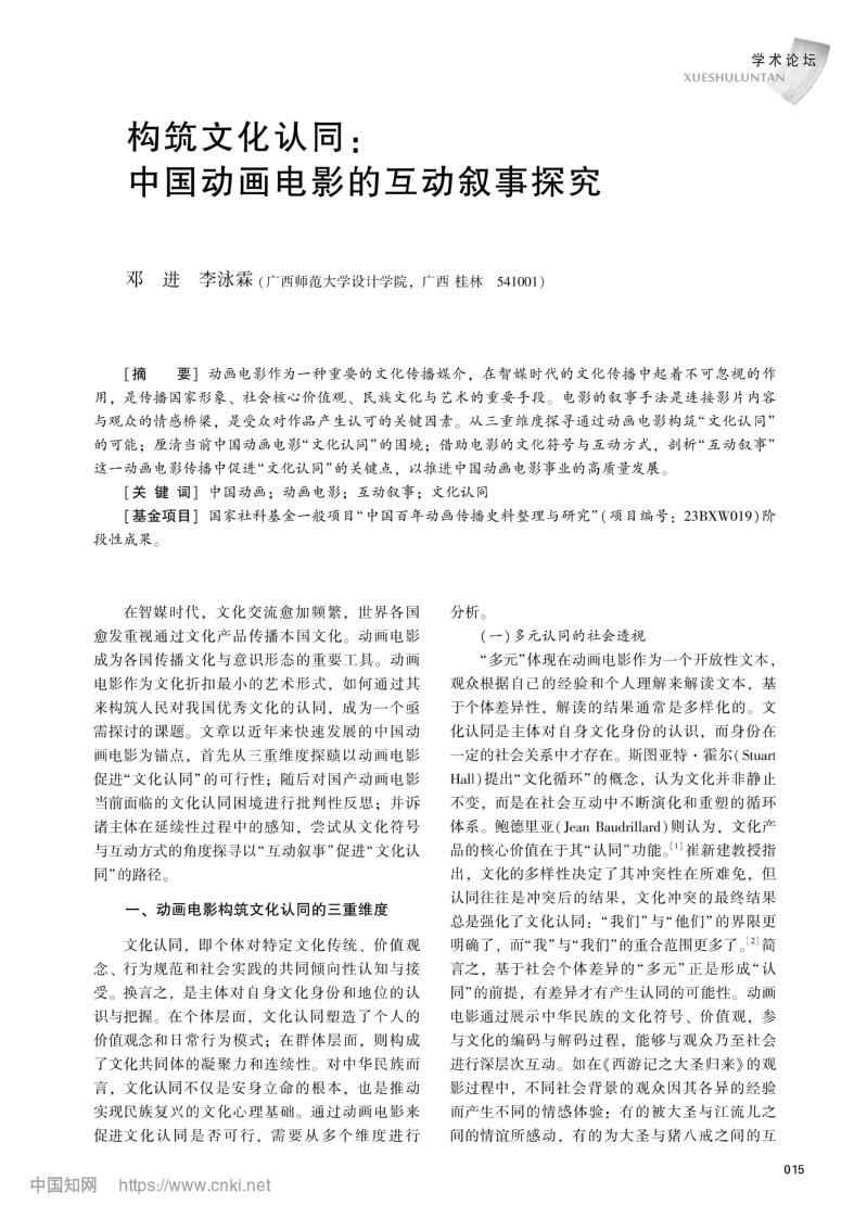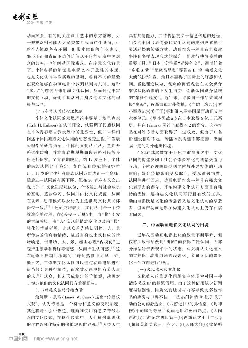 论文一:《构筑文化认同:中国动画电影的互动叙事探究》从社会、个体与跨文化三重维度阐释动画构建文化认同的潜力,指出当前国产动画存在文化符号重复、叙事浅表、互动不足等问题,提出应通过多元文化符号与多层次互动策略增强观众沉浸与文化认同。