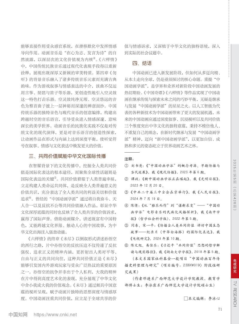 【主要内容】《中国动画百年传播史料整理与研究》系列论文——构筑文化认同:中国动画电影的互动叙事探究、从《六样情》看“新中国动画学派”的未来进路、从《浪浪山小妖怪》看中国动画电影的人民性表达,聚焦中国动画的文化表达与时代使命。