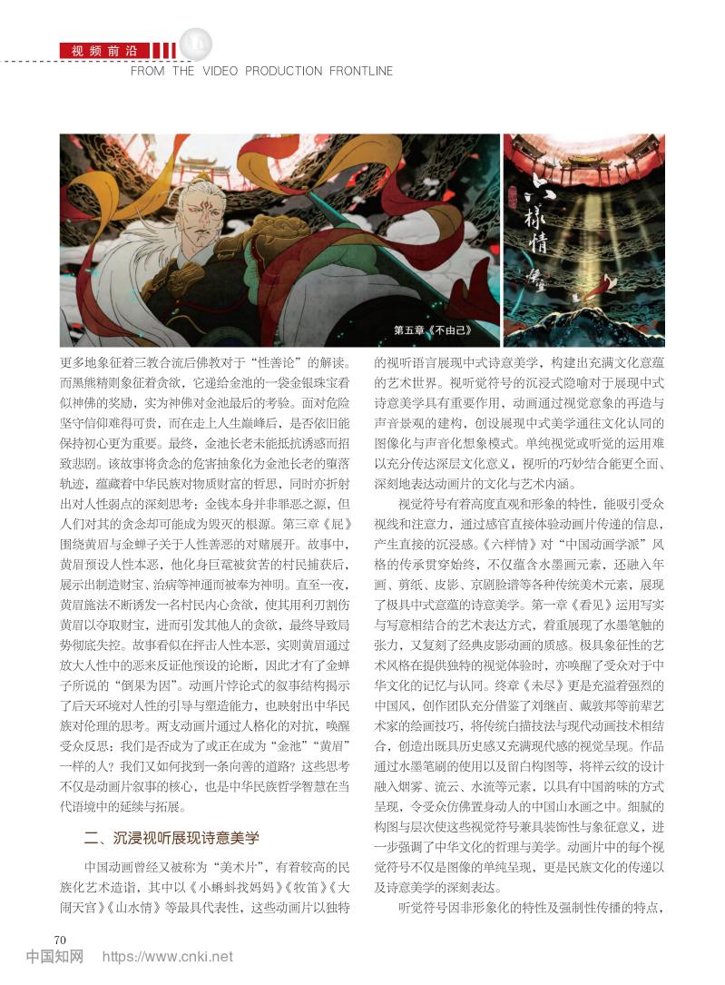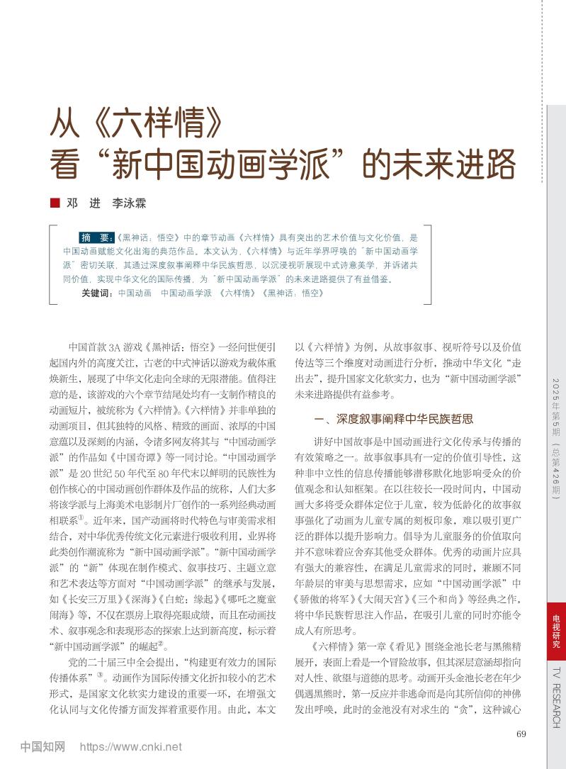 论文二:《从〈六样情〉看“新中国动画学派”的未来进路》以游戏动画《六样情》为例,分析其在叙事深度、民族美学与人类共同价值传达方面的突破,强调“新中国动画学派”应融合传统精神与现代视听语言,推动中国动画实现高质量、国际化发展。