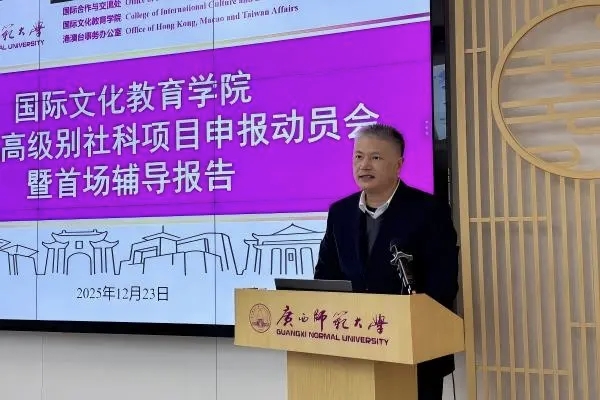 为推动学院科研工作高质量发展,国际文化教育学院于12月23日下午在国际教育交流中心2号楼209会议室召开2026年高级别社科项目申报动员会暨首场辅导报告。社会科学研究处处长/广西人文社会科学发展研究中心常务副主任肖富群教授出席会议并作辅导报告,国际合作与交流处/国际文化教育学院全体领导、教师参加会议。