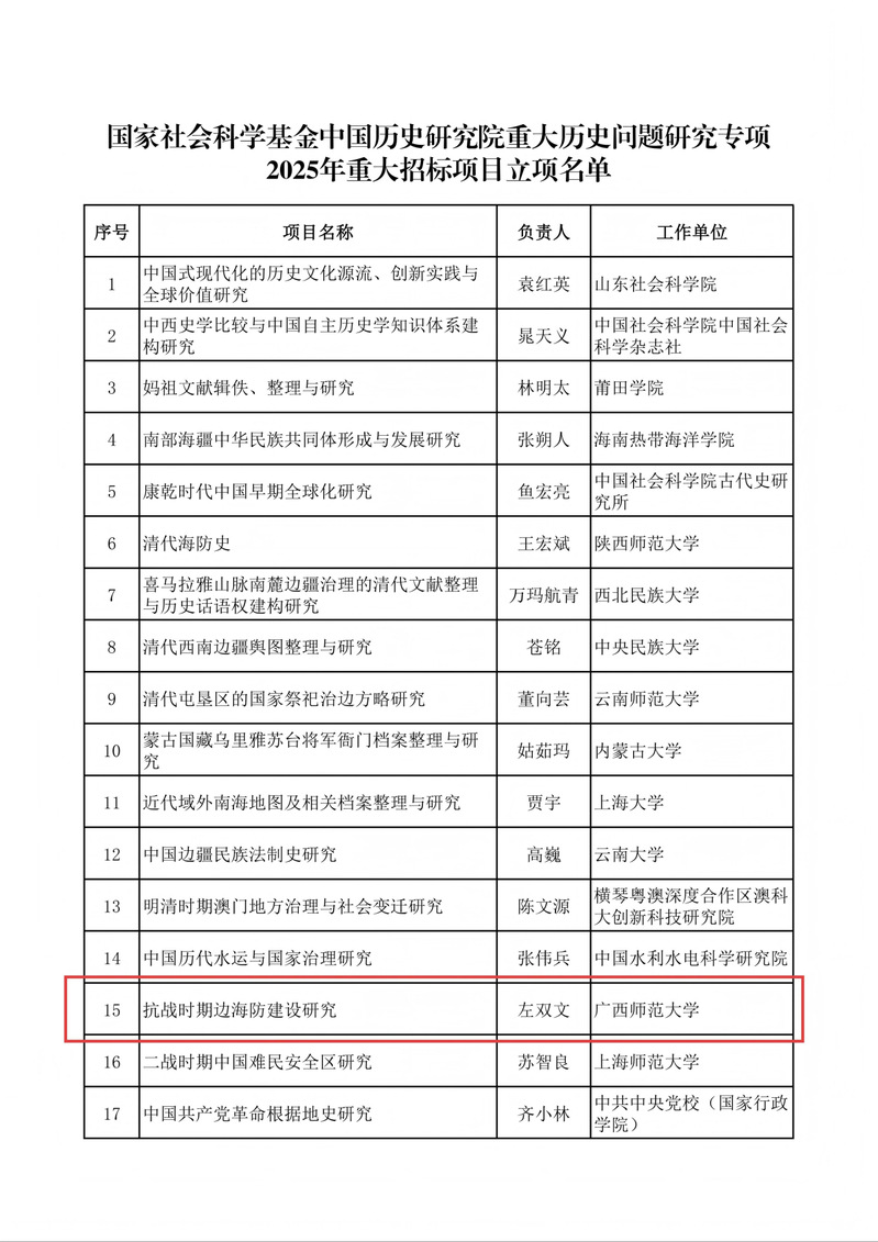近日,全国哲学社会科学工作办公室公布了国家社科基金中国历史研究院重大历史问题研究专项2025年度重大招标项目立项名单。由我校马克思主义学院左双文教授作为首席专家申报的课题《抗战时期边海防建设研究》成功获批立项。这是马克思主义学院获得的第5项国家社科基金重大项目,也是我校获批的第2项中国历史研究院重大历史问题研究专项。该项目获批立项,标志着我校2025年度国家社科基金重大项目立项数达3项,连续4年保持重大项目立项纪录,实现年度立项数量新突破。