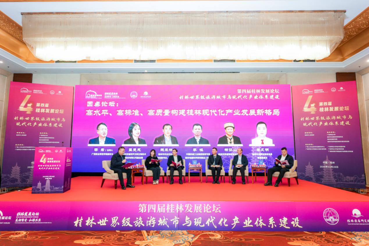 12月28日,在桂林市人民政府指导下,由广西师范大学、桂林市发展和改革委员会、桂林发展研究院、桂林市世界级旅游城市建设促进局共同主办的第四届桂林发展论坛在桂林桂山(华星)大酒店举行。本届论坛以“桂林世界级旅游城市与现代化产业体系建设”为主题,通过深入探讨产业振兴与城市升级的议题,为桂林高质量发展汇聚智慧。论坛包含主旨报告、圆桌论坛等环节,并发布了《桂林经济社会发展报告(2024-2025)——桂林产业振兴研究》蓝皮书。来自中国社会科学院、暨南大学等国内外高校、科研机构、政府部门和企业的代表作为特邀嘉宾出席。桂林市委常委、常务副市长谢立品,广西师范大学党委书记、桂林发展研究院院长贺祖斌出席会议并致辞。论坛开幕式由广西师大学党委常委、副校长林国庆主持。