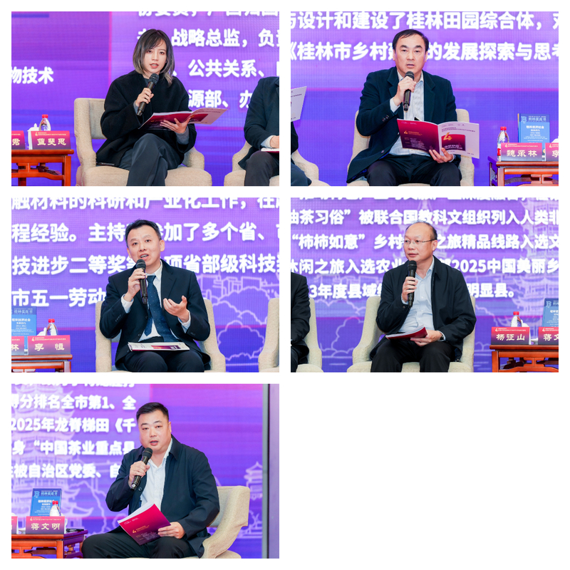 圆桌论坛由广西职业师范学院副校长梁君主持,聚焦“高水平、高标准、高质量构建桂林现代化产业发展新格局”。中国机械工业集团首席专家李恒探讨了建设世界级旅游城市背景下桂林现代产业体系发展路径;桂林市恭城瑶族自治县县长杨征山阐述了县域在世界级旅游城市与现代化产业体系建设中的使命与担当;桂林市农业农村局党组副书记、副局长魏承林分享了桂林市农业农村现代化发展的思考;桂林市龙胜各族自治县常务副县长蒋文明介绍了龙胜以特色产业体系建设助力桂林打造世界级旅游城市的实践;桂林吉福思罗汉果生物技术股份有限公司副总裁蓝斐思分享了以高质量发展为支点,构建桂林现代化农业产业新格局。嘉宾们就创新驱动、文旅融合、绿色发展等话题进行了深入交流。