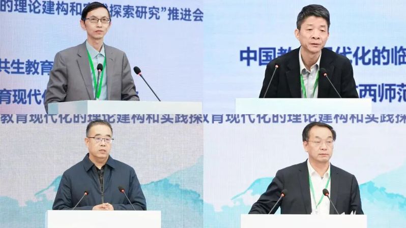 来自清华大学、北京师范大学、华东师范大学、华中师范大学、西南大学、陕西师范大学、中央民族大学、首都师范大学、复旦大学、安徽师范大学、杭州师范大学、天津教育科学研究院、南宁师范大学等近30所高校的专家学者,以及来自上海、浙江、内蒙古、安徽、四川、广西等地的教育行政部门、科研机构、中小学的有关负责人、校长等100余位代表参会。 我校党委副书记、校长孙杰远教授,首都师范大学田慧生教授分别在开幕式上致辞。开幕式由我校副校长宋树祥主持。孙杰远校长在致辞中回顾了我校以教育学一流学科建设为核心,依托国家社科基金重大项目推动学科内涵式发展的战略布局。他强调,教育现代化是中国式现代化的重要组成部分,教育研究与实践应立足国家战略、扎根中国大地,尤其应关注边疆、民族、乡村等区域的教育发展真问题,为教育强国建设提供理论支撑与实践路径。田慧生教授代表中国教育学会致辞,指出教育现代化不仅是设施与技术的升级,更是理念、体系与治理的深刻变革。他期待广西师范大学承担的重大项目能在理论突破、实践成效和机制创新上形成示范,为中国教育现代化贡献智慧与方案。