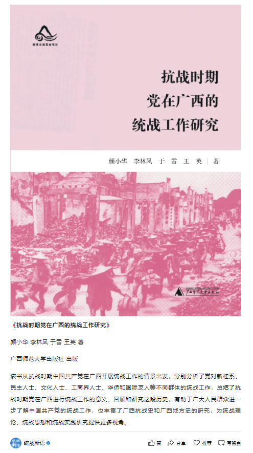 【社科成果】我校学术著作《抗战时期党在广西的统战工作研究》入选中央统战部官方公众号“统战新语”和《中国新闻》报2025“同心书单”