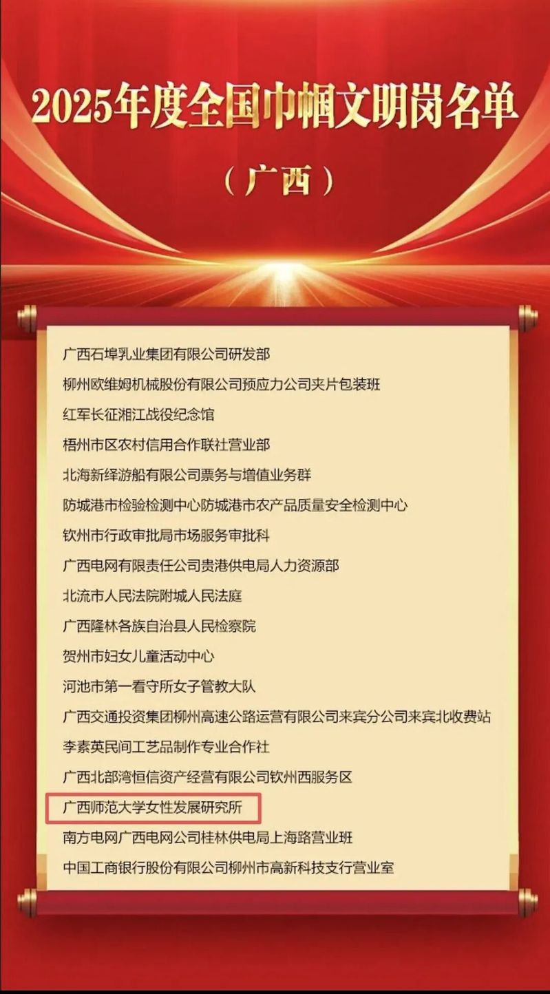 其中,我校女性发展研究所荣获“全国巾帼文明岗”称号。这是对我校在女性发展研究与实践领域所取得成绩的高度认可。