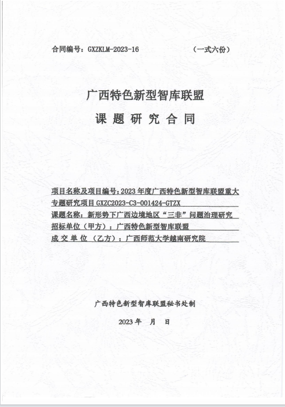 撰写的《新形势下广西边境地区“三非”问题治理研究》项目决策咨询报告,被自治区党委办公厅等省级部门采纳,并被中越边境地区诸多基层部门应用。为广西边境地区“三非”问题治理提供了全新而有效的治理方案参考。